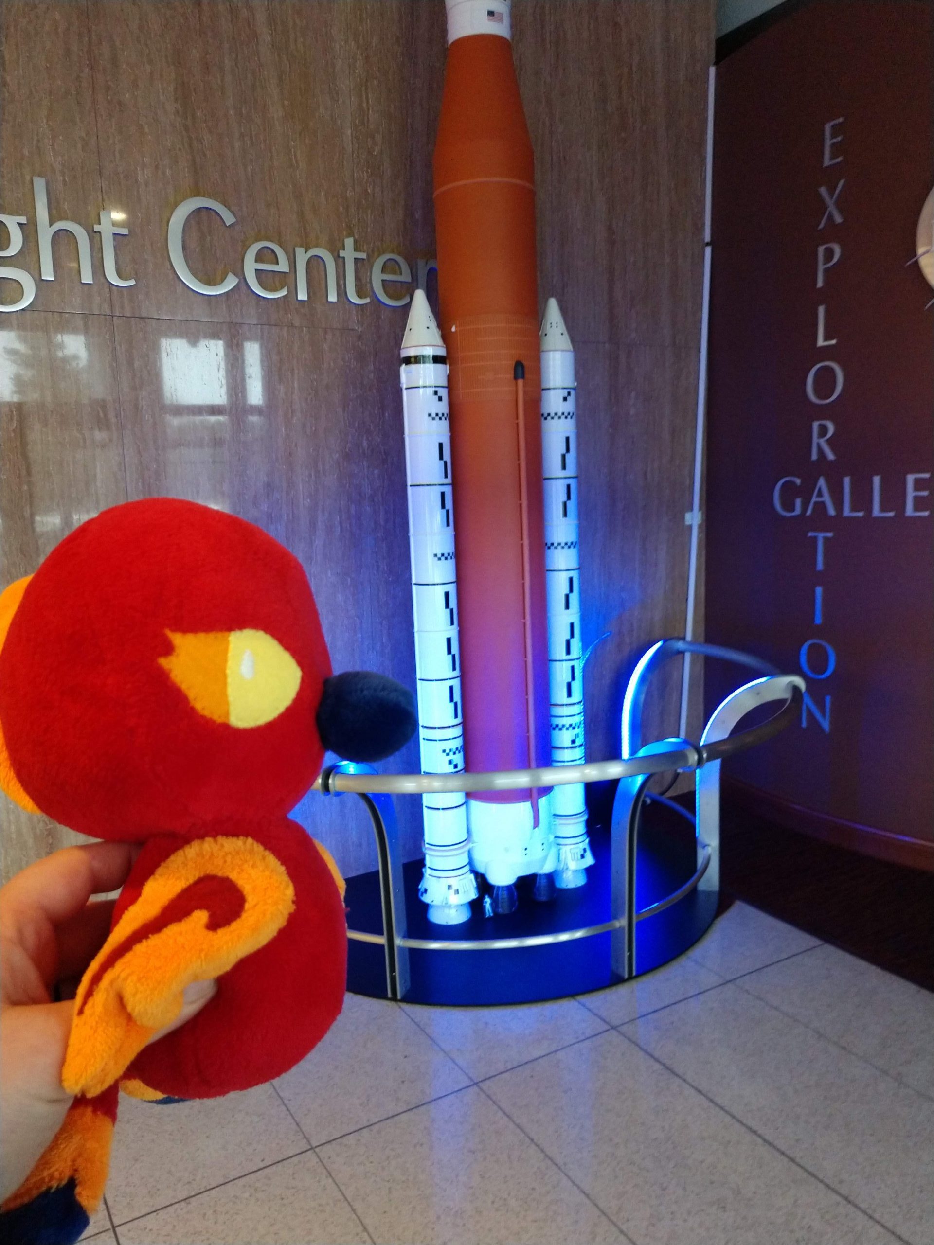 - Scotty the Starbird and a model of the Space Launch System (SLS)